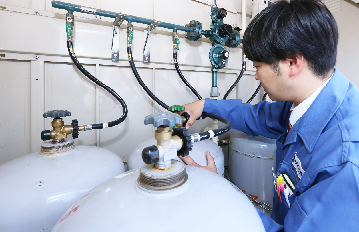 液化石油ガス法にもとづき、一般家庭の場合、プロパンガス(LPガス)設備の点検・調査は4年に1回以上行うことになっています。全てのお客さまを対象として調整器の機能点検、配管のガスもれ調査、ガス機器や給排気設備等の調査など、プロパンガス(LPガス)設備全般についての調査・点検を行います。皆さまが安全にガスをお使いいただくために必要な点検ですので、ご協力をお願いいたします。
