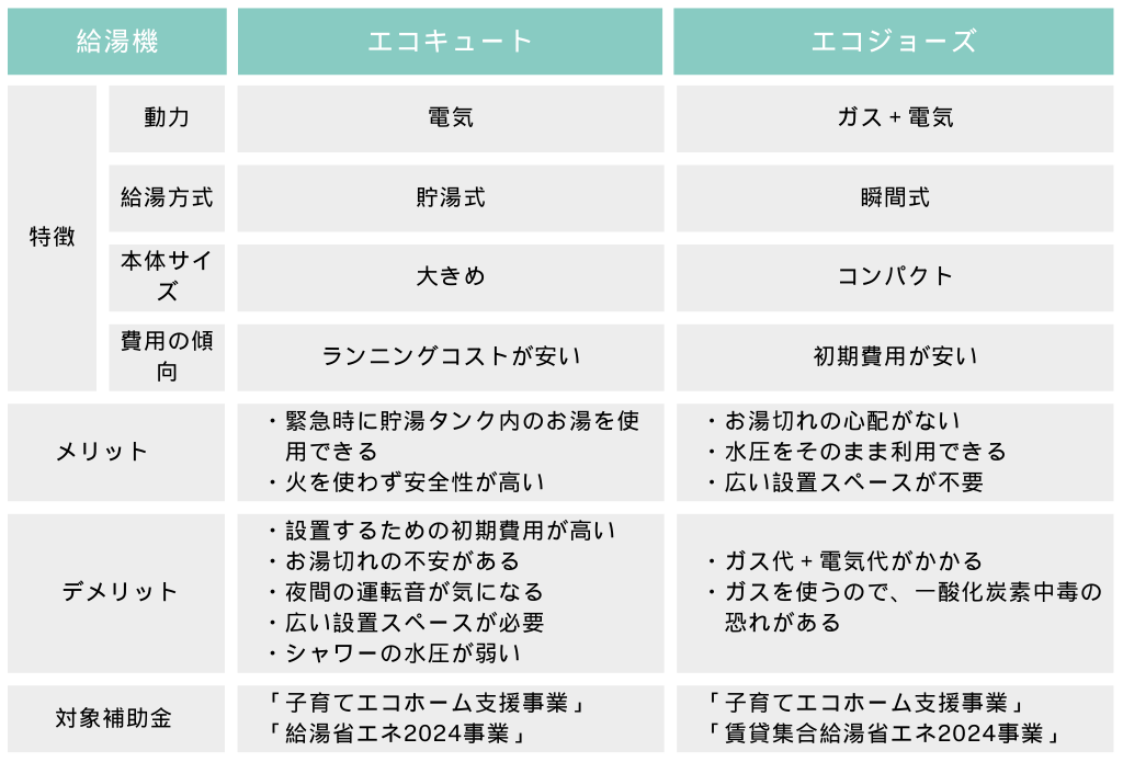 まずはエコキュートとエコジョーズの違いを一覧で比較してみます。